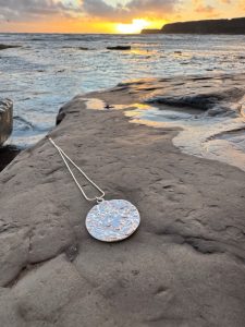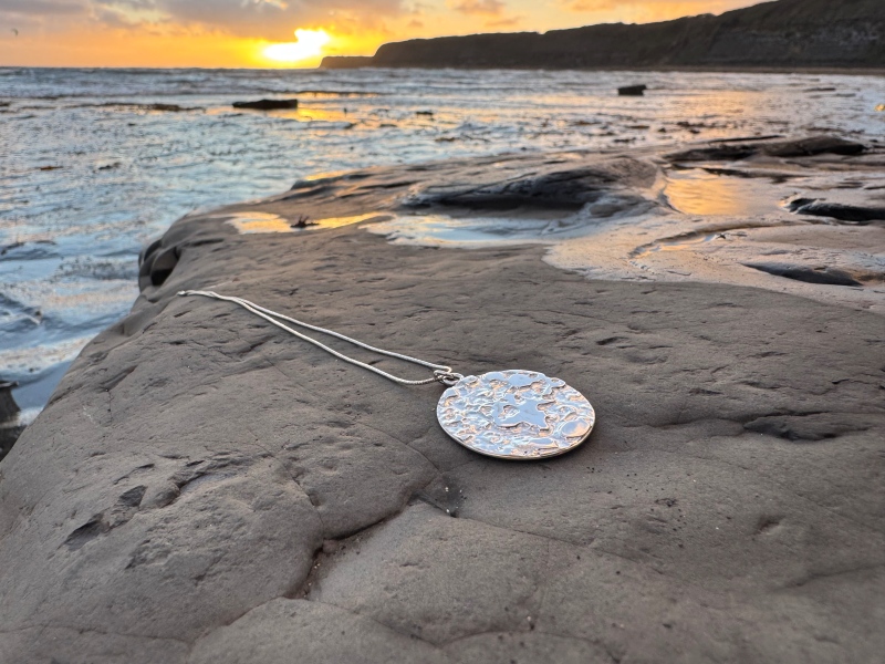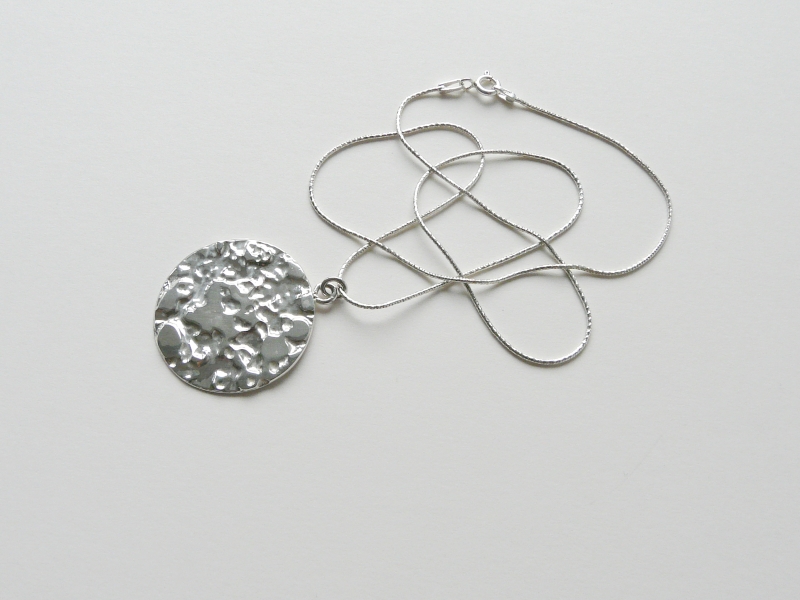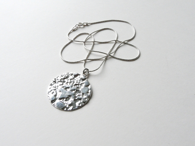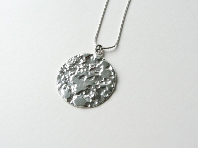 Silver round pendant, deeply etched with a polished finish. The pendant comes with a silver continuous filed snake chain.